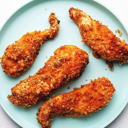 These low carb and keto air fryer chicken tenders use crushed pork rinds (you could also use panko) to make a super flavorful and crispy crust.